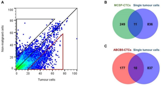 Conventionally, CTCs have been captured or detected by targeting the melanoma-associated chondroitin sulphate proteoglycan (MCSP, HMW-MAA, CSPG4, NG2) [5,7,8,9,10,22,23,24]. This cell surface proteoglycan, reported to be overexpressed in over 90% of melanoma tissue samples, is thought to increase the tumorigenic potential of melanoma cells, by increasing cell proliferation, survival, invasion, spreading, and migration [25,26]. However, we found in a previous study [5] that CTCs more commonly express melanoma-initiating markers, such as the ATP-binding cassette sub-family B member 5 (ABCB5) than melanoma-associated markers, such as MCSP. The transmembrane transporter ABCB5 is associated with melanomagenesis, stem cell maintenance, metastasis, and treatment resistance to MAPK inhibition [27,28,29]. Interestingly, we showed that ABCB5 is expressed only by rare subpopulations within patient-matched tumour tissues [5], supporting the hypothesis that CTCs are derived from rare subpopulations in the tumour with the potential to initiate metastases [28,30]. Taken together, it seems clear that cells positive for MCSP and ABCB5 represent two different CTC subpopulations, yet there is no knowledge about the differential biology of these subpopulations.