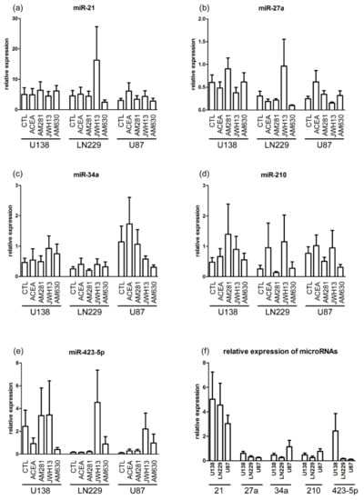All examined miRs, miR-21, miR-27a, miR-34a, miR-210, and miR-423-5p were found in the cell lines U-138 MG, LN229, and U-87 MG. The expression of miR-21, miR-27a, miR-34a, miR-210, and miR-423-5p in U-138 MG, LN229, and U-87 MG was measured and no significant changes after 24 h treatment with ACEA (10 µM), AM281 (1 µM), JWH133 (10 µM), and AM630 (1 µM) were detected (Figure 1a–f).