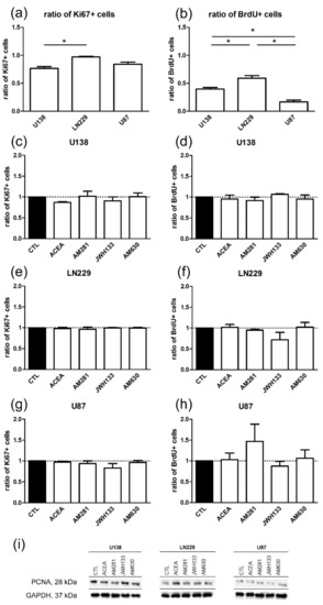 No changes in the proliferation index could be observed in U-138 MG, LN229, and U-87 MG cell lines after treatment with agonists (ACEA, 10 µM; JWH133, 10 µM) and antagonists (AM281, 1 µM; AM630, 1 µM) for CB1 and CB2 for 24 h. Differences occurred in the basal level of proliferation between the cell lines. Control groups of U-138 MG, LN229, and U-87 MG cell lines were compared in the ratio of positive cells for (a) Ki67 (nU138 = 4, nLN229 = 3, nU87 = 4) and (b) bromodeoxyuridine (BrdU) (nU138 = 3, nLN229 = 4, nU87 = 3). All cell lines had a significantly different expression of S-phase marker Brdu. The Ki67 index was significantly different between U-138 MG and LN229. LN229 cells have the highest level of proliferating cells followed by U-138 MG. Application of ACEA, AM281, JWH133, and AM630 did not influence the ratio of the BrdU and Ki67 positive cells in (c,d) U-138 MG (nCTL = 3, nACEA = 3, nAM281 = 3, nJWH133 = 3, nAM630 = 3); (e,f) LN229 (nCTL = 3, nACEA = 3, nAM281 = 3, nJWH133 = 3, nAM630 = 3); and (g,h) U-87 MG cells (nCTL = 3, nACEA = 3, nAM281 = 3, nJWH133 = 3, nAM630 = 3). (i) Representative Western Blots of G1 and S-phase marker, proliferating nuclear antigen (PCNA) and glyceraldehyde 3-phosphate dehydrogenase (GAPDH) show no significant differences between the groups. All data were normalized to the control group.