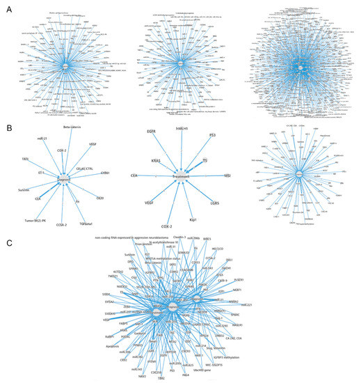 Distributions and interactions of CRC diagnosis, therapy and prognosis biomarkers from the CBD. The numbers mentioned on the lines means the amounts of articles for the correlated biomarkers. (A) The CRC biomarkers were classified according to their functions of diagnosis, therapy and prognosis. (B) The biomarkers reported by more than 2 articles are presented. (C) The interactions of diagnosis, therapy and prognosis biomarkers.