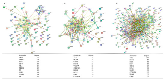 As shown in Figure 2, the CRC protein biomarkers were further analysed in the PPI networks for CRC diagnosis, therapy and prognosis. The biomarkers with the highest degree for the diagnosis were TP53, VEGF, IGF1 and CD44 (Figure 2A), for therapy were TP53, PCNA, CDH1 and so forth, (Figure 2B) and for prognosis were TP53, EGFR, MYC and so forth, (Figure 2C). TP53 was found as the biomarker with highest degree for all CRC diagnosis, therapy and prognosis. EGFR, Ras, CDH1 and BCL2 have been related to both CRC therapy and prognosis. (KRAS protein with therapy and HRAS protein with prognosis) CD44 is associated with both CRC diagnosis and prognosis. Most of the protein biomarkers were associated with CRC prognosis. The top 10 high degree protein biomarkers in each PPI network are selected and presented in Figure 2.