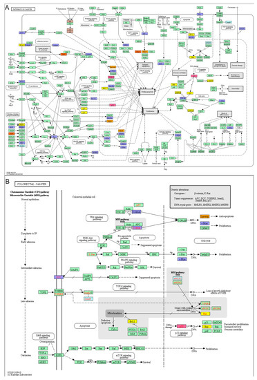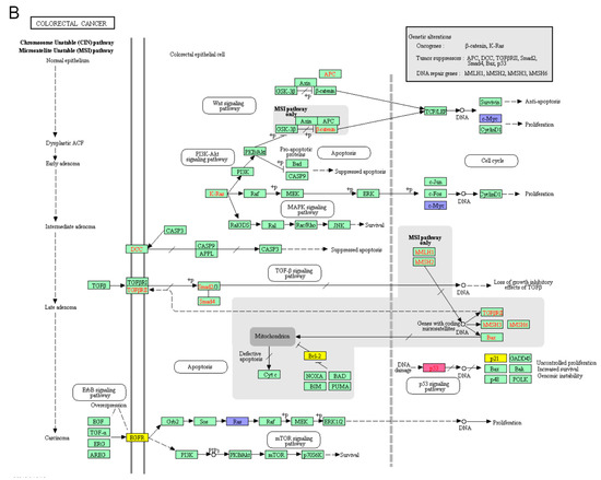 Biomarkers in the Pathways in cancer. (A) Various cancer pathways involve in different cancer initiation and progression. (B) CRC biomarkers for diagnosis, therapy and prognosis biomarkers in the CBD were mapped in different colours in Pathways in cancer. The CRC biomarkers have been associated with apoptosis, cell proliferation, VEGF signalling pathway and Ras signalling pathway in the Pathways in cancer. Red: diagnosis biomarker; Blue: treatment biomarker; Purple: prognosis biomarker; Orange: diagnosis & treatment biomarker; Yellow: treatment & prognosis biomarker; Pink: diagnosis & treatment & prognosis biomarker.