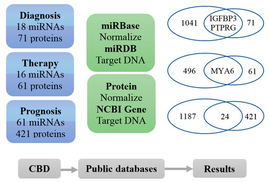 As shown in Figure 5, we analysed miRNA and protein biomarkers concerning CRC diagnosis, therapy and prognosis in our CBD database and found that there are 16 miRNA and 71 protein biomarkers for diagnosis in the CBD database. After standardization through miRBase (http://www.mirbase.org/) and NCBI protein database (https://www.ncbi.nlm.nih.gov/protein), the miRNAs and proteins were converted to their corresponding target DNAs in the miRDB database and NCBI Gene database. 1041 target genes in the miRDB were found for their 18 diagnosis miRNA biomarkers in our CBD and 71 corresponding genes in the NCBI Gene database were found for the 71 diagnostic protein biomarkers in the CBD. The converted DNAs for diagnostic miRNA and protein biomarkers were overlapped in the check points IGFBP3 and PTPRG. For the CRC therapy biomarkers, there were 16 miRNAs and 61 proteins. After the standardization and converting to DNAs, MYA6 was found as the check point for both miRNAs and proteins for CRC therapy. There were 61 miRNAs and 421 proteins were found as the CRC prognostic biomarkers in our CBD database. After the standardization and converting to their corresponding DNAs, 24 check points were found to associate with CRC prognosis between 1187 for miRNAs and 421 for proteins.