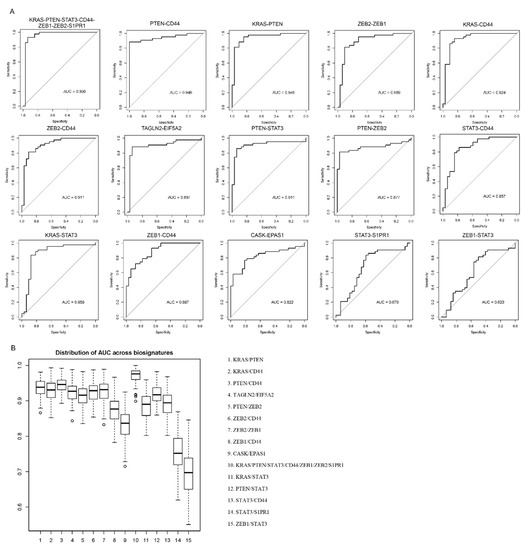 Diagnostic performance of multiple biomarkers for CRC. (A) The receiver operating (ROC) curves of all the 15 multiple biomarkers. (B) Distributions of AUC across biosignatures. The area under curve (AUC) statistics from 100 random training/testing divisions. The 15 multiple biomarkers were ranked.