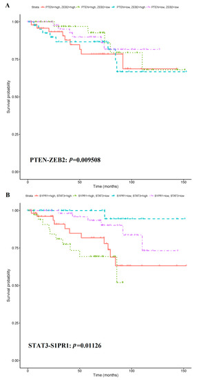 AI-assisted prognosis analysis showed that five of the 15 combined had statistical significance to predict CRC prognosis. Of these, 5 biosignatures were significant at a level of 0.05 using the log-rank test. After multiplicity correction using the Holm FWER correction, a single biosignature was significant, the PTEN-ZEB2 pair. Its corresponding Log rank Score is 9.31. Further analyses revealed that the CRC patients with lower S1PR1 levels had better prognosis and those with higher S1PR1 levels had worse prognosis, independent of PTEN and STAT3 (Figure 8).