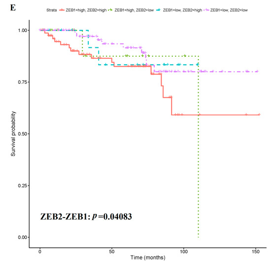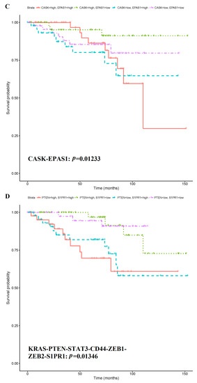 Kaplan-Meier survival curves of five multiple biomarkers with significant prognosis value. (A) Kaplan-Meier survival curves of multiple biomarker combined by PTEN and ZEB2. (B) Kaplan-Meier survival curves of multiple biomarker combined by STAT3 and S1PR1. (C) Kaplan-Meier survival curves of multiple biomarker combined by CASK and EPAS1. (D) Kaplan-Meier survival curves of multiple biomarker combined by KRAS, PTEN, STAT3, CD44, ZEB1, ZEB2 and S1PR1. (E) Kaplan-Meier survival curves of multiple biomarker combined by ZEB2 and ZEB1.