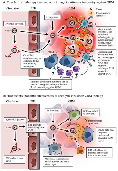 Schematic picture summarizing the events and factors related to successful oncolytic immunotherapy (A), and to limited effectiveness of oncolytic viruses (B) in GBM. Abbreviations: BBB: blood–brain barrier, GBM: glioblastoma, TAA: tumor-associated antigen, NAb: neutralizing antibody, APC: antigen-presenting cell, CNS: central nervous system, GSC: glioma stem cell, NK: natural killer cell.