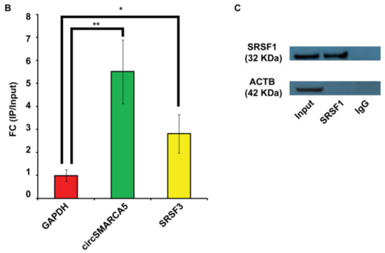 CircSMARCA5 was predicted to be bound by SRSF1 in at least seven different evolutionarily conserved sites (see [19] and Figure 1A). SRSF1 RNA immunoprecipitation (RIP) allowed us to validate this interaction, showing a significant enrichment of circSMARCA5 in addition to SRSF3 mRNA, a known splicing target of SRSF1 (positive control), in immunoprecipitated U87-MG cells lysate with respect to a negative control (Figure 1B,C).