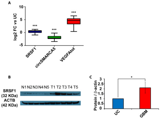 SRSF1, circSMARCA5 and VEGFA expression in GBM biopsies and unaffected controls (UC). (A) Box-and-whisker plots, representing the expression of SRSF1, circSMARCA5 and total VEGFA RNA in the studied cohort. Data are represented as log2 fold change (FC) values versus UC. (*** p-value < 0.001, N(GBM) = 31, N(UC) = 20, Mann–Whitney test). (B) Western blot of SRSF1 in a selection of UC (N) and GBM (T) samples. ACTB was used as a loading control. (C) Bar graph representing densitometric quantification of SRSF1. Data, shown as mean ± standard deviation, represent fold change versus UC (* p-value < 0.05, N(GBM) = 14, N(UC) = 8, two-sample t-test).