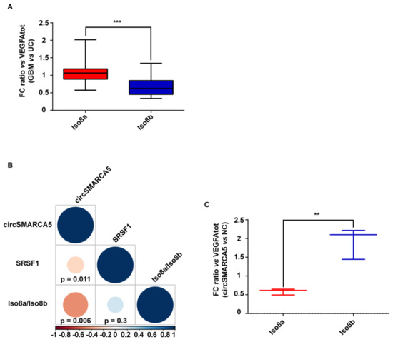 Iso8a-to-Iso8b ratio in GBM biopsies vs. UC. (A) Box-and-whisker plots, representing the ratios between fold changes of Iso8a and total VEGFA (VEGFAtot) and Iso8b and VEGFAtot in GBM compared to UC (*** p-value < 0.00001, N = 27, Mann–Whitney test) (see Section 4 Materials and Methods for details on data analysis). (B) Correlation matrix among the expression of circSMARCA5 and SRSF1 and Iso8a-to-Iso8b ratio. Positive and negative correlations are displayed in blue and red colors, respectively. The color scale bar indicates r values. Color intensity and the size of the circle are proportional to the correlation coefficients into the correlogram. (C) Box-and-whisker plots, representing the ratios between fold changes of Iso8a and VEGFAtot and Iso8b and VEGFAtot in U87-MG overexpressing circSMARCA5 with respect to U87-MG transfected with the empty vector (NC) (** p-value < 0.001, N = 3, two-sample t-test) (see Section 4 Materials and Methods for details on data analysis).