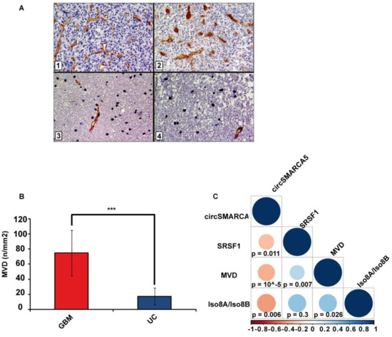 MVD in GBM and UC samples. (A) Representative immunohistochemical staining for CD31 showing areas of high MVD with multiple branching vessels in glioblastoma tissue (1 and 2) and a lower MVD in unaffected brain tissue (3 and 4). Immunoperoxidase staining; 400× magnification (B) Bar graph representing the mean MVD in GBM and UC samples. Data are represented as mean ± standard deviation (*** p-value < 0.00001, N(GBM) = 31, N(UC) = 18, two sample t-test). (C) Correlation matrix among MVD, circSMARCA5 and SRSF1 expression and Iso8a to Iso8b ratio. Positive and negative correlations are displayed in blue and red color, respectively. Color scale bar indicates r values. Color intensity and the size of the circle are proportional to the correlation coefficients into the correlogram.