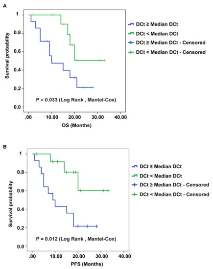 Kaplan–Meier overall survival (OS) and progression-free survival (PFS) curves of GBM patients, based on the expression of circSMARCA5. Patients having a lower expression of circSMARCA5 (DCt ≥ Median DCt) survive less (A) show a shorter PFS (B) than patients with a higher expression of circSMARCA5 (DCt < Median DCt).