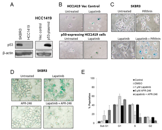 Figure 3. (A) Protein expression levels of p53 in SKBR3 and HCC1419 cells. HCC1419 cells were transfected with either empty control vector (vec control) or wild-type p53 plasmid and the resulting expression of p53 was analyzed by western blotting. β-actin was used as a loading control. (B) SA-β-gal activity in HCC1419 empty vector control cells and p53-expressing cells with and without 250 nM lapatinib. (C) SA-β-gal activity in SKBR3 cells treated with pifthrin (100 nM) alone and in combination with lapatinib (250 nM) for 1 week. (D) SA-β-gal activity in SKBR3 cells treated with lapatinib (250 nM) and/or APR-246 (5 µM) for 2 weeks. (E) Cell cycle analysis of SKBR3 cells treated with lapatinib (250 nM) and/or APR-246 (5 µM) for 5 days (error bars reflect n = 3). Images taken at 400× magnification.