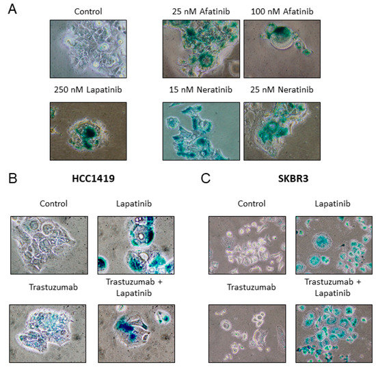 Figure 4. (A) HCC1419 cells were treated with varying concentrations of either neratinib or afatinib for 1 week. Cells were then fixed and stained for SA-β-gal activity and compared to untreated control and lapatinib treated cells. (B) HCC1419 cells were treated with 10 µg/mL trastuzumab alone or in combination with 250 nM lapatinib for 1 week, prior to SA-β-gal activity testing. (C) SKBR3 cells were treated with 10 µg/mL trastuzumab alone or in combination with 250 nM lapatinib for 2 weeks, prior to SA-β-gal activity testing. Images taken at 400× magnification.