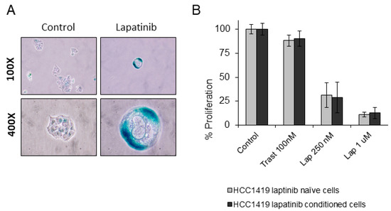 Figure 6. (A) HCC1419 cells were treated twice weekly with 250 nM lapatinib for 6 months. The resulting cells were tested for SA-β-gal activity. Images taken at 100× and 400× magnification. (B) The effects of trastuzumab and high and low dose lapatinib on HCC1419 cells which were lapatinib naïve or which had been previously conditioned for 6 months with 250 nM lapatinib followed by 3 months growth in lapatinib-free media. Cells were treated with the indicated concentrations of drug and then growth was measured after 5 days and is expressed relative to untreated control cells (error bars reflect n = 3).