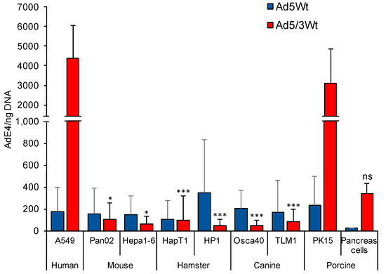 Statistical analyses in vitro and in vivo were performed with the Excel data review function (Microsoft 2016). The paired sample t-test was used for comparing the effects of Ad5 and Ad5/3 in the gene transfer assay in the human and non-human cell lines as well as in the porcine tissues. Results with a two-tailed p-value < 0.05 were considered statistically significant. The data are presented as the mean values with error bars representing the standard deviation.
