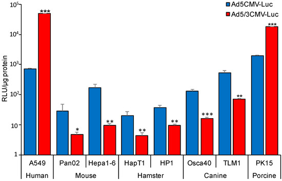 Gene transduction of Ad5 and Ad5/3 in non-human cells. Mouse, hamster, canine, and porcine cells along with human controls were infected with replication-deficient Luciferase expressing vectors, Ad5CMV-Luc and Ad5/3CMV-Luc. Luciferase activity was determined 2 days post infection. Infection with Ad5 efficiently transduced all non-human cells. Compared to Ad5, Ad5/3 gene transfer was significantly lower in rodent and canine cells but higher in porcine cells (* p < 0.05, ** p < 0.005, *** p < 0.001 Denotes significance to Ad5 infected cells).
