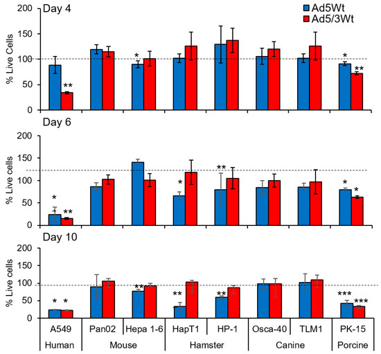 Quantitative cell viability analysis after infection with Ad5 and Ad5/3. All cell lines were infected with either Ad5 or Ad5/3 wild type replication viruses. Cell viability (% live cells) was assessed with MTS assay 4, 6, and 10 days post infection. Murine Pan02, hamster, and porcine cell lines showed significant reduction in viability after Ad5 infection. Infection with Ad5/3 retargeted viruses caused significant cell death only in porcine PK15 cells and A549 human controls (* p < 0.05; ** p < 0.0001; *** p < 0.000001 Denotes significance to uninfected cells).
