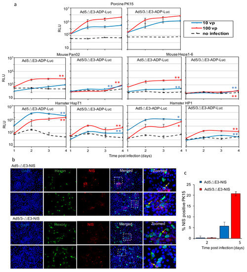 For analysis of Luciferase gene expression, we used a replication-competent Ad5-∆E3-Luc, and its identical counterpart Ad5/3-∆E3-Luc. Mouse, hamster and porcine cells were cultured in 24 well-plates (5.0 × 104 cells/well) and infected with at 10 and 100 vp/cell for 4 h. Infection medium was removed, and infected cells cultured in appropriate growth medium. Luciferase activity was assayed in untreated and virus treated cells 1, 2, 3, and 4 days post-infection using the Luciferase Assay kit is described above. The data is represented as relative light units (RLU). For qualitative analysis of NIS gene expression, we used a replication competent Ad5∆E3-NIS, and identical counterpart Ad5/3∆E3-NIS [55,56]. Porcine cells were cultured in chamber slides (25,000 cells per well) and infected with Ad5- and Ad5/3∆E3-NIS at 10 vp/cell for 24 h. Unbound virus was washed away, and cells fixed in 4% Paraformaldehyde Solution. Fixed cells permeabilized on ice with 0.25% Triton-X100 (Sigma Chemicals cat. no) were the blocked in 2.0% BSA before primary antibody incubation at 4 °C overnight (NIS: Anti-FP5A (Thermo Fisher Scientific, Minneapolis, MN, USA Cat no. MA5-12308 at 1:500) and Anti-Ad-Hexon FiTC-conjugated Millipore (Massachusetts, USA, Cat no. AB1056F) at 1:1000. Mouse Anti-IgG-PE conjugated secondary antibodies (cat no. A32727) were incubated for 1 h at room temperature to anti-FP5A. Slides were cover-slipped with DAPI Anti-fade solution (Vector Labs, CA, USA) before image capturing using a fluorescence microscope (Leica, Minneapolis, MN, USA). For quantitative analysis of NIS gene expression, we used the same NIS expressing vectors to infect Porcine cells cultured in 6 well plates (2.5 × 105 cells per well) and infected with Ad5- and Ad5/3Wt-∆E3-NIS at 10 vp/cell for 2 h. Unbound virus was washed away, and infection media replaced with fresh growth media. Cells were collected by scraping 2- and 5 days post infection and fixed in 4% Paraformaldehyde Solution before staining for NIS expression. NIS stained cells were analyzed on a BD 8-color Flow cytometer (BD Biosciences, San Jose, CA, USA). The data is expressed as the % of NIS expressing cells in 10,000 events.