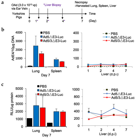 Immunocompetent Yorkshire pigs (20–25 kg) were pre-anesthetized with telazol/xylazine, anesthetized with nembutal, and intubated with a cuffed endotracheal tube in a standard surgical suite. A single viral dose of Ad5∆E3-Luc, or Ad5/3∆E3-Luc at 3 × 1012 vp was injected via a peripheral ear vein (1 pig per group). Control pig received PBS containing 7% glycerol. Percutaneous liver biopsies were performed on sedated pigs with a true-cut biopsy needle to analyze Ad distribution at days 1, 2, and 4 post-infection. On day 7, all pigs were euthanized with beuthansia D, and liver, lungs and spleen tissues were immediately harvested and cut in half at the center. Half of tissue samples were fixed with buffered formaldehyde for immunostaining and pathological analysis, the second half was snap-frozen and stored at −80 °C until the total DNA was extracted from ~25 mg of tissues. PCR was used to determine the E4 viral DNA copy number as an indication of virus distribution in 1ug of DNA using a standard curve with known E4 gene copies. Luciferase activity was determined in spleen, lung and liver as an indication of viral replication. A complete blood count test (CBC) and blood chemistry analysis was performed on blood serum at Marshfield laboratory (Madison, WI, USA) [57,58]. The clinical pathology and histopathology analyses were performed by an independent Board-Certified Veterinary Pathologists (Experimental Surgical Services, Surgery Department, University of Minnesota, Minneapolis, MN, USA).
