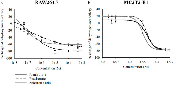 | Drugs | RAW264.7 Emax (%) | RAW264.7 IC50 (M) | RAW264.7 Hill Slope | MC3T3-E1 Emax (%) | MC3T3-E1 IC50 (M) | MC3T3-E1 Hill Slope |