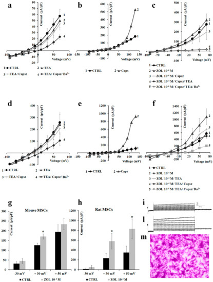 2.3. Pharmacological Characterization of the Whole-Cell Currents of Native Mesenchymal Stem Cells (MSCs) from Bone Marrow of Mouse and Rat