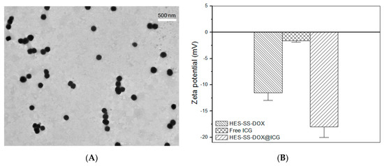The size of drug-loaded NPs is known to play a key role in regulating the in vivo performance of the NPs. It has been suggested that NPs with a size less than 200 nm are likely to accumulate in the tumor via the EPR effect, and large NPs such as those larger than 300 nm would be easily caught by RES in the liver and spleen [1,27,28]. Therefore, the size of HES-SS-DOX@ICG NPs needs to be well modulated. In this study, besides the size of HES-SS-DOX@ICG NPs, the ratio of DOX to ICG is also an important parameter for their anti-cancer efficiency. The size and composition of HES-SS-DOX@ICG NPs were synchronously optimized by mainly altering the molar ratio of HES-SS-DOX conjugates and ICG. Since the absorption wavelength of HES-SS-DOX@ICG NPs partially overlaps with the detection wavelength of the bound ICG inside NPs, the size of HES-SS-DOX@ICG NPs was determined using their TEM images rather than the regularly used dynamic light scattering instrument. Based on TEM image analyses, the mean size of HES-SS-DOX@ICG NPs was measured as ca. 170 nm, which signifies that they are suitable for in vivo usage from the perspective of the size account. ζ potential of ICG, HES-SS-DOX, and HES-SS-DOX@ICG NPs was also measured, and data are depicted in Figure 1B. It can be seen that ICG and HES-SS-DOX conjugates were negatively charged with ζ potential of around 1.6 and 11 mV and HES-SS-DOX@ICG NPs had their ζ potential of about 18 mV, which is significantly greater (p < 0.05) than the sum of ζ potentials of ICG and HES-SS-DOX conjugates. This demonstrates that charges in the HES-SS-DOX@ICG NPs have been redistributed due to the collaborative interactions occurring between ICG and HES-SS-DOX conjugates.
