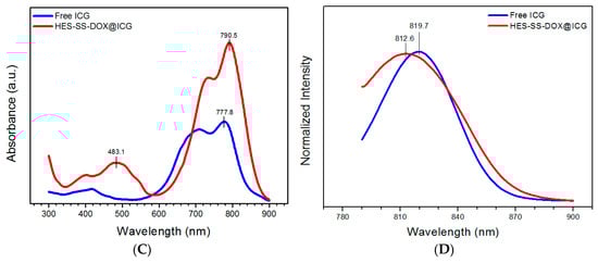 With respect to HES-SS-DOX@ICG NPs, the band at ca. 483 nm was ascribed to their DOX component and the wide band with its shape that is somewhat similar to that for free ICG was moved to the higher wavelength interval, which is characterized by the maximum intensity at ca. 790 nm. In comparison to free ICG, the wavelength at the maximum intensity for HES-SS-DOX@ICG NPs was red-shifted by about 13 nm. In Figure 1D, a pronounced difference in wavelength was also detected when the maximum fluorescence intensity for free ICG was compared with that for HES-SS-DOX@ICG NPs. On the basis of these results, it can be inferred that the collaborative force arisen from electrostatic, hydrophobic, and π–π stacking interactions between ICG molecules and HES-SS-DOX conjugates has driven them to organize into certain assemblies, which leads to significant wavelength shifts occurring for the ICG component in HES-SS-DOX@ICG NPs. The similar wavelength shifts for ICG have also been mentioned in some studies where ICG and DOX were used together for chemo/photothermal combination therapies, and our findings are basically consistent with the reported results [23,29,30].