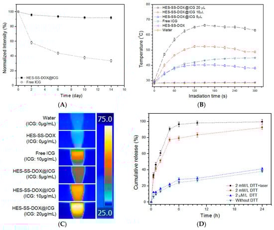 ICG has been used as imaging or photothermal agents for diagnostic and therapeutic purposes [15,16]. Despite its many applications, ICG usually shows poor stability in aqueous media and is prone to aggregate. The former could lead to short-lived ICG and the latter would cause the low efficiency of ICG. HES-SS-DOX@ICG NPs were tested to assess whether they have an ability to maintain the stability of the loaded ICG, and relevant results are presented in Figure 2A. After two-day storage, the intensity of HES-SS-DOX@ICG NPs was remained at around 96% but the intensity of free ICG already dropped to 58% of its initial value. Thereafter, the UV absorbance intensity of free ICG progressively decreased until it reached approximately 34% at the end of two weeks. On the other hand, the absorbance intensity of HES-SS-DOX@ICG NPs decreased only slightly within two weeks and it remained as high as 92% on day 14. These results demonstrate that HES-SS-DOX@ICG NPs can effectively maintain the stability of the loaded ICG in aqueous medium. The protective effect of HES-SS-DOX@ICG NPs on the loaded ICG molecules can be attributed to the composition and structure of NPs themselves. As mentioned early, HES-SS-DOX@ICG NPs were composed of a number of ICG-bound HES-SS-DOX conjugates, and, hence, most ICG molecules were encapsulated inside the HES-SS-DOX@ICG NPs. Accordingly, in the HES-SS-DOX@ICG solution, most ICG molecules inside HES-SS-DOX@ICG NPs would not be directly exposed to the aqueous environment, which leads to their high stability.