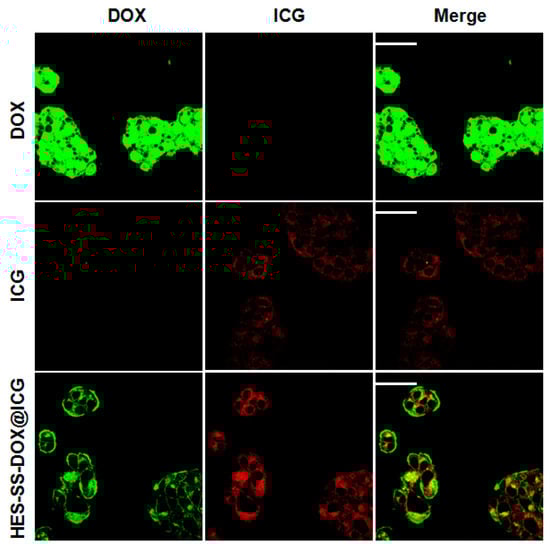 The subcellular localization of free DOX, free ICG, and HES-SS-DOX@ICG NPs in HepG2 cells was investigated and the results are represented in Figure 3. After 4 h of incubation, free DOX was found to mainly localize inside the cell nucleus of HepG2 cells, which is consistent with our previous results [9]. With respect to free ICG, the image shows that it was homogenously distributed in the cytoplasm of HepG2 cells, which is similar to the observation in previous studies where ICG was found to mainly bind to intracellular proteins (glutathione S-transferase) [20,31]. As for HES-SS-DOX@ICG NPs, the matched image exhibits that DOX was located in both the cytosol and the nucleus of HepG2 cells. The possible reason is that some DOX molecules released from the internalized HES-SS-DOX@ICG NPs further entered into the cell nucleus. However, some other DOX molecules were still trapped inside HES-SS-DOX@ICG NPs because the co-incubation was 4 h and HES-SS-DOX@ICG NPs need a longer time for internalization as well as the following DOX release.