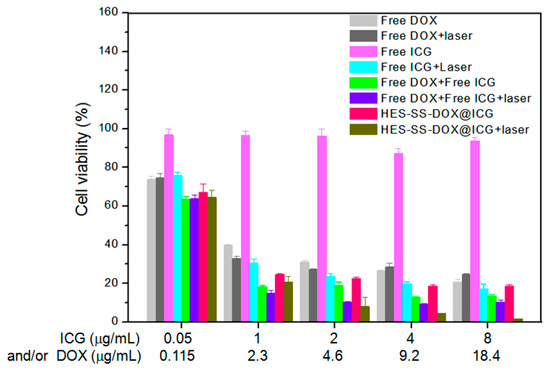 HepG2 cells were used to assess the cytotoxicity mediated by different chemo-photothermal treatments. HepG2 cells were seeded in wells of 96-well culture plates at a density of 5 × 104 cells/well with complete medium for 24 h. Subsequently, cell groups were treated with free DOX, free ICG, free DOX/ICG blend, and HES-SS-DOX@ICG NPs for 24 h, respectively. The amount of DOX and ICG in the applied four kinds of solutions was altered at the same pace and the ratio of DOX to ICG was maintained at 2.3. Several such-treated cell groups were further exposed to a laser at an irradiation dose of 0.75 W/cm2 for 5 min. The cell viability for cell groups with or without laser irradiation treatments was assessed using an MTT assay. The cell group without any mentioned treatments was used as a control, designating as 100% cell viability.