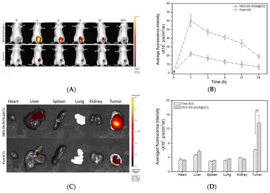 Representative fluorescence images and average fluorescence intensity. Real-time fluorescence images (A) of H22-tumor bearing BALB/c mice and matched fluorescence intensity (B) detected at different time points. (C) Ex vivo fluorescence images of major organs and tumors excised from two groups of mice and matched average fluorescence intensity (D) (harvesting time of organs and tumors in H22-tumor bearing mice, at 1 h after injection of free ICG or HES-SS-DOX@ICG NPs. ** p < 0.01. n = 4).