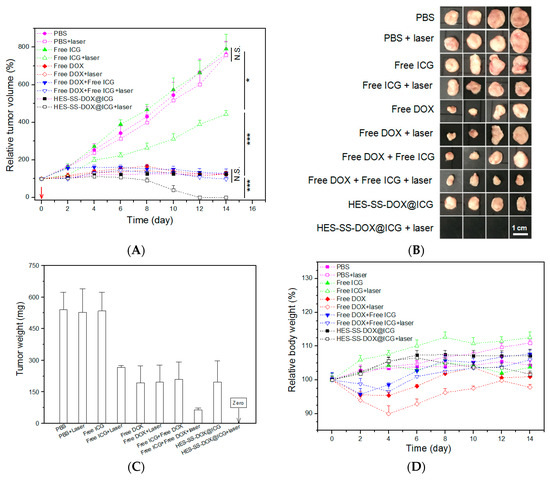 Time-dependent variations of tumor volume (A), images (B), and average weight (C) of tumors excised from mice after 14 days of treatment, and changes in body weight (D) for the treated mice (the inserted red arrow indicates the day for the injection, irradiation intensity, and time for all involved cases were 0.75 W/cm2 and 5 min. The applied equivalent amount of DOX and ICG was 8 mg/kg and 3.4 mg/kg. N.S., no significance. * p < 0.05. *** p < 0.001. n = 4).