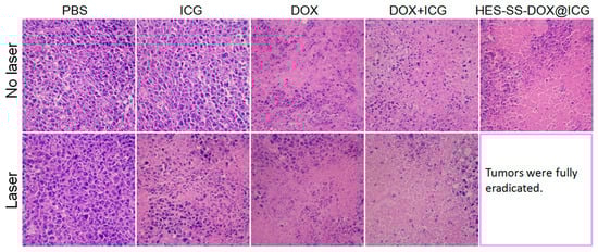 The residual tumors harvested at the end of treatments were also sectioned into slices for histological analysis, and their H/E staining micrographs are presented in Figure 8. In comparison to the control (PBS group), many cells in the tumors of mice that were treated with free ICG + laser were necrotic or apoptotic, which is indicated by the reduced cell number and the shrunken or broken nuclei (denoted by a dark purple color). The treatments involved in free DOX with or without laser irradiation had a similar efficacy against tumors, but they seemed to be somewhat more efficient than that in the free ICG + laser group in view of the increased purple-free area in the matched micrographs. In the absence of laser irradiation, the treatment based on free ICG + free DOX only had a limited efficiency against tumors. Together with laser irradiation, the efficiency of this treatment was significantly improved, as shown by the large purple-free area in the corresponding micrograph. Similarly, only with laser irradiation, HES-SS-DOX@ICG NPs would be able to fully eradicate cancer cells. The results presented in Figure 8 were basically consistent with those elucidated in Figure 7.