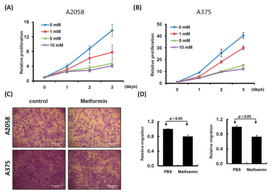 The human melanoma cell lines A375, A2058, HS695T, MeWo and RPMI7951 were cultured in Dulbecco’s modified Eagle’s medium (Invitrogen GIBCO, Carlsbad, CA, USA) supplemented with 10% fetal bovine serum (HyClone, Thermo Scientific, UT, USA), 2 mM glutamine, 10 μg/mL of streptomycin and 100 U/mL of penicillin. Melanoma cells were treated with metformin at various concentrations (1, 5, and 10 mM), and cell growth was observed for three consecutive days.