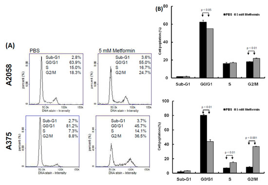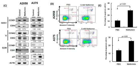Two human melanoma cell lines, A2058 and A375, were treated with various concentrations of metformin (0, 1, 5, and 10 mM) for three consecutive days. Cell proliferation was examined using the CellTiter-Glo One solution assay at day 0, 1, 2, and 3. As depicted in Figure 1A,B, the growth of more than 70% of cells was significantly suppressed on day 3 after treatment with 5 or 10 mM metformin compared with no metformin treatment. Furthermore, the suppressive effects of 0, 1, and 5 mM metformin were dose-dependent (Figure 1A,B); however, the suppressive effects of 5 and 10 mM metformin were similar. On the basis of these results, we used 5 mM metformin to treat melanoma cells for the following assays. According to the results of the migration assay, the migration ability of A2058 and A375 cells was significantly suppressed after treatment with 5 mM metformin (Figure 1C,D). Similar results were also observed in the MeWo and RPMI7951 but not in Hs695T cells (Figure S1). Furthermore, the effects of metformin-induced inhibition of motility were observed only in the MeWo cells, but not in the RPMI7951 and Hs695T cells (Figure S1). We further investigated the effects of metformin on the cell cycle of melanoma cells by using image-flow cytometry analysis. When A2058 and A375 cells were incubated with 5 mM metformin, the number of cells at the S and G2/M phases increased and the number of cells at the G0/G1 phase decreased compared with those in the control group (Figure 2A,B). Similarly, metformin could significantly suppress the growth of MeWo and RPMI7951 cells by impairing cell cycle progression, whereas no effect was observed on the Hs695T cells (Figure S1). Furthermore, the expression levels of CCNA2, CCNB1, CDK1, and CDK4 decreased in melanoma cells treated with metformin, whereas the levels of p21 and CCND1 increased (Figure 2C). In addition, the population of apoptotic cells significantly increased in A2058 and A375 cell lines after 5 mM metformin treatment (Figure 2D,E). These results indicated that melanoma cells growth could be suppressed after metformin treatment through impairing cell cycle progression and inducing cell apoptosis.