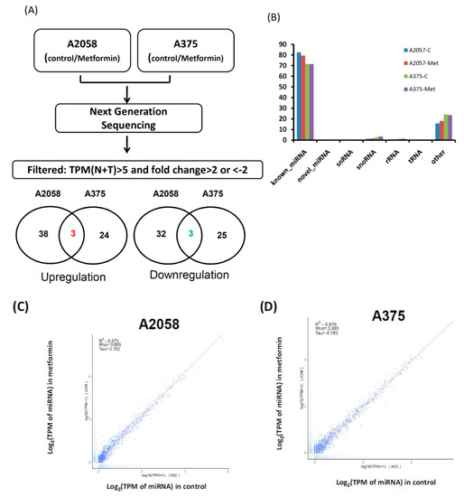 Flowchart of process to identify metformin-regulated miRNA candidates in melanoma cells through next generation sequences (NGS). (A) Small profiles of A2058 and A375 cells treated with or without metformin were analyzed using NGS. Comparison of the miRNA expression profiles between the control and metformin treatment samples and filtering steps are as follows: (1) fold change ≥ 2 or ≤ 2 and (2) sums of Transcript per million (TPM) in control and treatment groups ≥ 5. Venn diagrams depict the number of upregulated and downregulated miRNA candidates in A2058 and A375 cells treated with or without metformin. (B) Categories of sequence reads in four libraries were detected after mapping the human database. (C) Scatter plot of miRNA distribution in A2058; metformin treatment (Y-axis) vs. control group (X-axis); (D) scatter plot of miRNA distribution in A375; metformin treatment (Y-axis) vs. control group (X-axis).