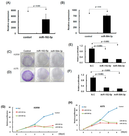 Growth of melanoma cells was suppressed after transfection of miR-192-5p and miR-584-3p mimics candidates. (A) and (B): After transfection of miRNA mimics, the relative expression levels of miR-192-5p and miR-584-3p were examined through real-time PCR. (C) and (D): After miR-192-5p, miR-584-3p, and control, respectively, were transfected into melanoma cells, the cells were incubated for two weeks and the colony was examined with crystal violet. (E) and (F): Relative colony formation ability was quantified using OD595 nm. (G) and (H): Proliferation of melanoma cells with or without miR-192-5p or miR-584-3p overexpression was examined on four consecutive days using the CellTiter-Glo One solution assay.