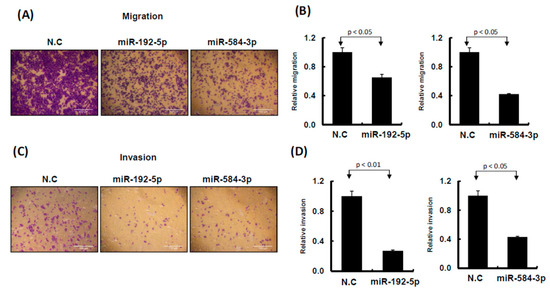 To understand the functional roles of these metformin-regulated miRNAs in melanoma cell lines, we performed the gain-of-function assay by using the miRNA mimics transfection approach. The expression levels of individual miRNA in A2058 cells after miRNA mimics transfection were confirmed through real-time PCR. The expression levels of miR-192-5p and miR-584-3p in A2058 cells were significantly increased after transfection with mimics of miR-192-5p or miR-584-3p, respectively (Figure 4A,B). Furthermore, we investigated the colony formation ability of melanoma cells after miR-192-5p and miR-584-3p overexpression. The colony formation ability of melanoma cells was clearly suppressed after transfection with miR-192-5p and miR-584-3p mimics (Figure 4C–F). Similarly, the results of the cell proliferation assay revealed that cell proliferation was suppressed by miR-192-5p and miR-584-3p in melanoma cells (Figure 4G,H). Further examination of the cell cycle distribution indicated that the cell cycle was significantly arrested at S and G2/M after ectopic expression of miR-192-5p and miR-584-3p (Figure 5A,B). As depicted in Figure 5C, the expression levels of CDK4 and CDK1 were consistently decreased, whereas those of CCND1 increased in A2058 cells after transfection with miR-192-5p mimics and miR-584-3p mimics. In addition, the population of apoptotic cells significantly increased when miR-192-5p or miR-584-3p was overexpressed in A2058 cells (Figure 5D,E). We also assessed the effects of transfection with miR-192-5p and miR-584-3p mimics on the cell invasion ability of A2058 and A375 melanoma cells. The invasion ability of A2058 cells was clearly suppressed by miR-192-5p and miR-584-3p (Figure 6A–D). Similar results revealed that miR-192-5p and miR-584-3p could significantly suppress the growth and motility of the MeWo, RPMI7951, and Hs695T cells (Figures S2 and S3). Furthermore, miR-192-5p and miR-584-3p also could impair cell cycle progression (Figure S2). To summarize, miR-192-5p and miR-584-3p affected the invasion ability of melanoma cells and suppressed their growth by inducing cell cycle arrest at the S and G2/M phase and triggering the progression of cell apoptosis. To confirm the role of miR-192-5p and miR-584-3p in metformin-induced inhibition of motility, we attempted to improve the effects of metformin-induced inhibition of motility ability of melanoma cells by using miR-192-5p and miR-584-3p inhibitor transfection. As indicated in Figure S4, the metformin-induced motility ability repression in melanoma cells could be partially improved after miR-192-5p and miR-584-3p inhibitor transfection.