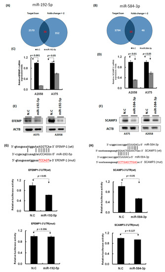 We further constructed the wild-type and mutant 3′UTR region of EFEMP1 and SCAMP3 into the pmiR-reporter vector (Figure 7G,H). The luciferase activity of wild-type EFEMP1-3′UTR significantly decreased (p < 0.05) in the A2058 cell line transfected with miR-192-5p mimics, as determined through the luciferase reporter assay (Figure 7G middle panel), whereas the luciferase activity of mutant EFEMP1-3′UTR for miR-192-5p’s binding site was not altered (Figure 7G lower panel). Using the same approach, we determined that the luciferase activity of wild-type SCAMP3-3′UTR significantly decreased (p < 0.05) in the A2058 cell line transfected with miR-584-3p mimics (Figure 7H middle panel); however, the luciferase activity of mutant SCAMP3-3′UTR was unchanged (Figure 7H lower panel). These results indicated that miR-192-5p could inhibit EFEMP1 expression and miR-584-3p could suppress SCAMP3 expression by directly targeting their 3′UTR regions.