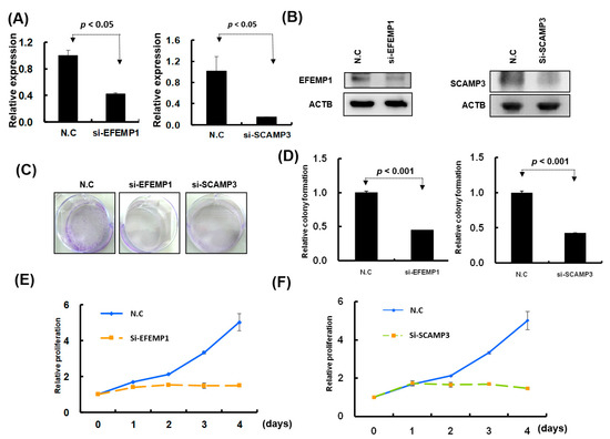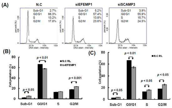 The western blotting assay was performed as previously described [65]. The following primary antibodies were used in present study: EFEMP1 (GTX111657, GeneTex, Inc, Irvine, CA, USA), SCAMP3 (GTX102216, GeneTex, Inc, Irvine, CA, USA), CCNA2 (1:1000; 18202-1-AP, Proteintech Group, Inc., Rosemont, IL, USA), CCNB1 (1:1000; 55004-1-AP, Proteintech Group, Inc., Rosemont, IL, USA), CCND1 (1:1000; RM-9104-S, Thermo Fisher Scientific Inc., Waltham, MA, USA), p21 (1:1000; #2947, Cell Signaling Technology, Inc., Beverly, MA, USA), CDK1 (1:200; 10762-1-AP, Proteintech Group, Inc., Rosemont, IL, USA), CDK2 (1:100; MS-459-P, Thermo Fisher Scientific Inc., Waltham, MA, USA), CDK4 (1:1000; MS-299-P, Thermo Fisher Scientific Inc., Waltham, MA, USA), actin (MAB1501, Millipore), and GAPDH (GTX627408, GeneTex).