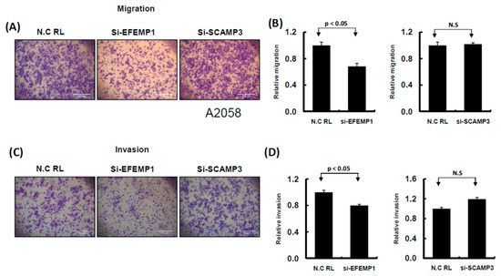 Knockdown of EFEMP1 and SCAMP3 expression influenced the cell invasion ability of melanoma cells. (A) and (C): Migration and invasion ability were examined by Transwell assay in A2058 cells. After knockdown of EFEMP1 and SCAMP3, or scramble control transfection for 24 h, cells were subjected to Transwell assay. The migrating and invading cells were stained with crystal violet solution. (B) and (D): Then, the numbers of migrating or invading cells were quantified by counting three different fields under a phase-contrast microscope. The cell photographs from a representative experiment are presented and the graph data were quantified using Ascent software. Data are reported as colonies compared with control (means ± SD).