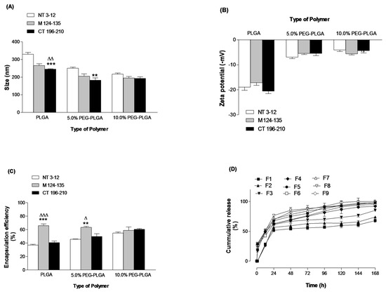Effects of polymer type on size (A), zeta potential (B), encapsulation efficiency (C) and in vitro release (D). Values are mean ± SD with n = 3. For 1A–C, ** p < 0.01, *** p < 0.001 compared with NT 3–12. Δ p < 0.05, ΔΔ p < 0.01, ΔΔΔ p < 0.001 compared with M 124–135.