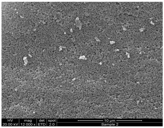 The data in Figure 1 clearly show that increasing the PEG content in the polymeric structure of PLGA NPs leads to a reduction in mean diameter to approximately 200 nm and an improvement in peptide loading. This observation was consistent across the three peptides used in this work. Subsequently, in further studies, the 10% PEG-PLGA particle matrix was selected as the optimal particulate matrix. Figure 2 shows the scanning electron microscope (SEM) image of 10% PEG-PLGA NPs, which exhibited a monodisperse size range with a smooth spherical surface free from pores.