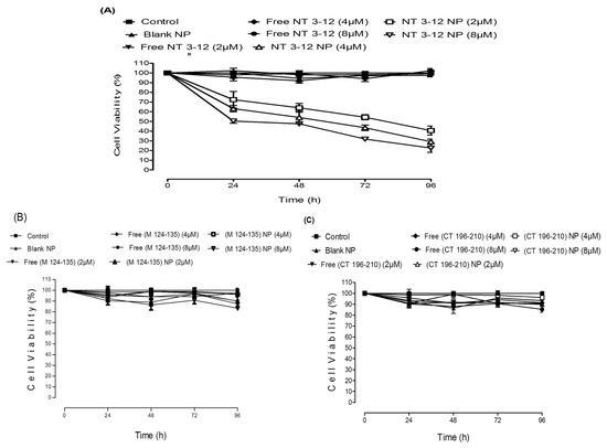 A549 cell viability results of different doses of NT 3–12 peptide and NT 3–12 peptide-loaded NPs (A), M 124–135 peptide and M 124–135 peptide-loaded NPs (B) and CT 196–210 peptide and CT 196–210 peptide-loaded NPs (C) after 24, 48, 72 and 96 h.