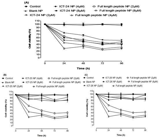 MDA-MB-231 Cell viability results of different doses of deleted peptide NPs and full length NT 3–12 peptide-loaded NP. ICT-24 peptide-loaded NPs (A), ICT-25 peptide-loaded NPs (B) and ICT-26 peptide-loaded NPs (C) after 24, 48, 72 and 96 h.