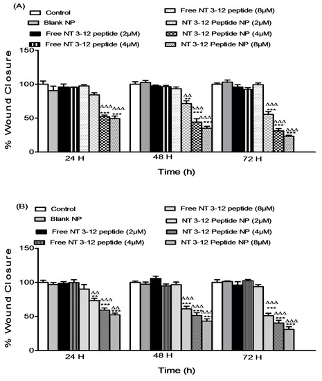 An in vitro scratch assay was conducted on both MDA-MB-231 and A549 cell lines to investigate the effect of different doses of free N-terminal peptide and N-terminal peptide-loaded NPs on the migration capacity of two metastatic cell lines. Migration of adherent cancer cells is the translocation of these cells from one location to another. Migration of cancer cells from the primary tumor site to other sites is a predominant feature of metastatic MDA-MB-231 and A549 cancer cells [30]. Results in Figure 5A,B show the quantification of the degree of scratch closure in breast and lung cancer cell lines relative to the DMSO and blank nanoparticulate controls.