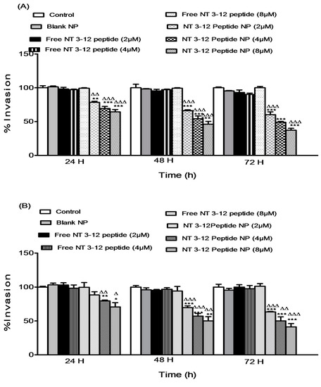 An in vitro invasion assay was conducted on lung and breast cancer cell lines to investigate the effect of different doses of free peptide and N-terminal peptide-loaded NPs on cell invasiveness. Dissemination of tumor cells from the primary site to distant locations starts with cell detachment followed by local invasion of the normal tissues adjacent to the tumor then infiltration through the lymphatic drainage system [30]. Treatment with N-terminal peptide-loaded NPs inhibited the invasion of both invasive MDA-MB-231 and A549 cancer types. Results in Figure 6A,B show the degree of invasion of treated breast and lung cancer cell lines through a Matrigel® membrane relative to the cells treated with DMSO and blank nanoparticulate controls. Treatment with N-terminal peptide-loaded NPs resulted in a significant decrease in cell invasion compared to free peptide for all concentrations in both cell lines. In MDA-MB-231 cells, after 72 h of treatment, reductions of 35.3%, 45.7% and 62.8% in invasiveness were observed after treatment with 2, 4 and 8 µM of N-terminal peptide-loaded NPs, respectively. Furthermore, N-terminal peptide-loaded NPs showed a significant reduction compared to free peptide treatments in A549 cells. Reductions of 36.6%, 48.5% and 59.1% in cell invasion after 72 h of treatment were observed with 2, 4 and 8 µM of N-terminal peptide-loaded NPs, respectively. These results showed that N-terminal peptide-loaded NPs inhibit invasiveness of lung and breast cancer cells. N-terminal peptide-loaded NPs sustained and improved the anti-invasive efficacy of the free peptide, which is essential for inhibiting metastasis of invasive breast and lung cancer cells.