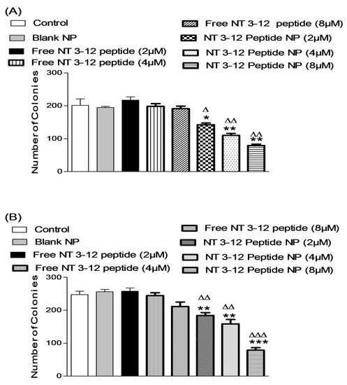 Effect of different doses of free N 3–12 peptide and N 3–12 peptide-loaded NPs on MDA-MB-231 number of colonies (A) and A549 number of colonies (B). Values are mean ± SEM with n = 3. * p < 0.05, ** p < 0.01, *** p < 0.001 compared with Control and blank NP. Δ p < 0.05, ΔΔ p < 0.01, ΔΔΔ p < 0.001 compared with the same dose of free peptide.