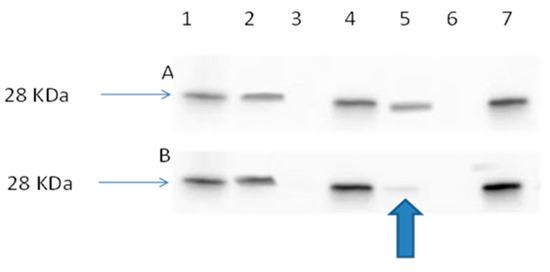 (A) Immunoblot image of lung cancer cell line (A549), control cells and (A549) cell line treated with blank 10% PEG-PLGA NP. Immunoblot positive control, (lane 1). A549 control cell lysate, (Lane 2). A549 control cell lysate after spiking with GDP (worked as negative control), (Lane 3). A549 control cell lysate after spiking with GTPγS (worked as positive control), (Lane 4). A549 cell lysate after treatment with blank NP, (Lane 5). A549 cell lysate after treatment with blank NPs and spiking with GDP, (Lane 6). A549 cell lysate after treatment with blank NPs and spiking with GTPγS, (Lane 7). (B) Immunoblot image of A549 cells treated with free NT 3–12 peptide and A549 cells treated with NT 3–12 peptide-loaded NPs. Immunoblot positive control, (lane 1). A549 cell lysate after treatment with NT 3–12 free peptide, (Lane 2). A549 control cell lysate after treatment with NT 3–12 free peptide and spiking with GDP (worked as negative control), (Lane 3). A549 control cell lysate after treatment with NT 3–12 free peptide and spiking with GTPγS (worked as positive control), (Lane 4). A549 cell lysate after treatment with NT 3–12 peptide-loaded NPs, (Lane 5). A549 cell lysate after treatment with NT 3–12 peptide-loaded NPs and spiking with GDP, (Lane 6). A549 cell lysate after treatment with NT 3–12 peptide-loaded NPs and spiking with GTPγS, (Lane 7).